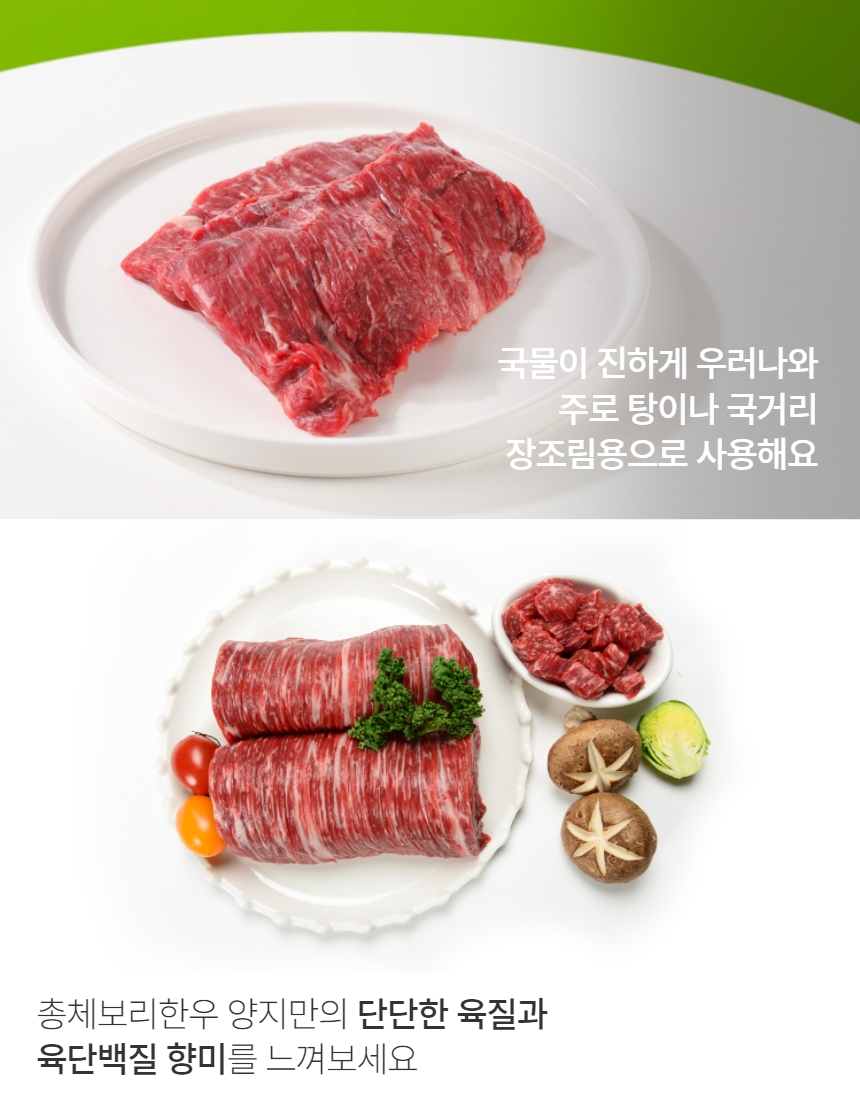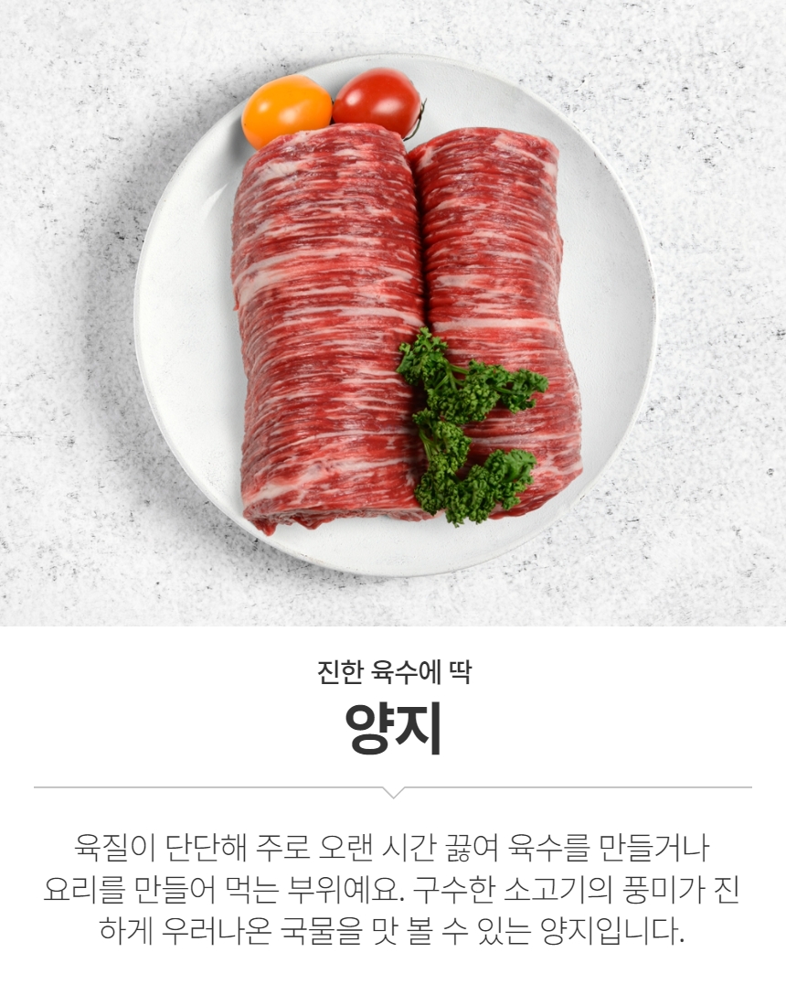 육질이 단단해 주로 오랜 시간 끓여 육수를 만들거나 요리를 만들어 먹는 부위예요. 구수한 소고기의 풍미가 진하게 우러나온 국물을 맛볼 수 있는 양지입니다.