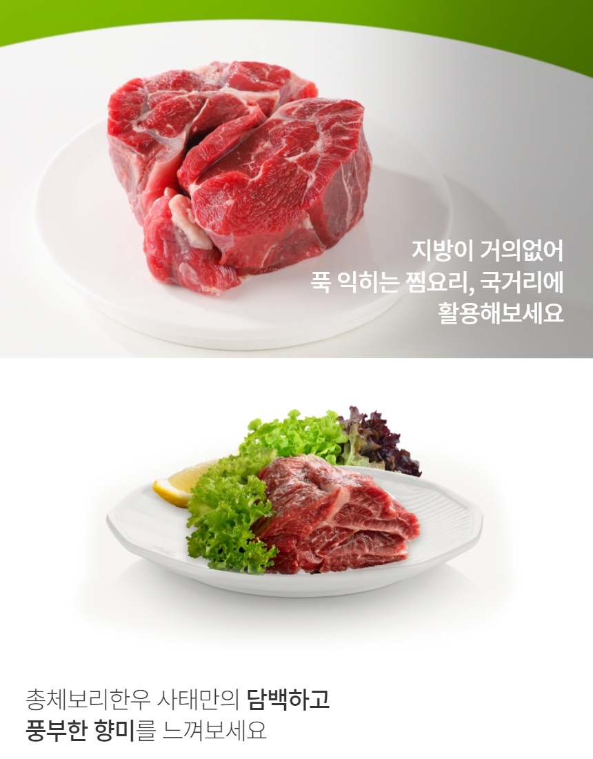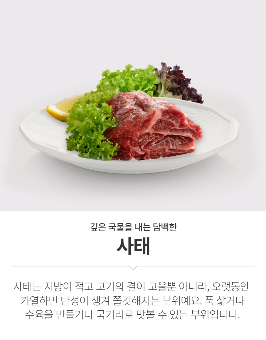 사태는 지방이 적고 고기의 결이 고울뿐 아니라, 오랫동안 가열하면 탄성이 생겨 쫄깃해지는 부위예요. 푹 삶거아 수육을 만들거나 국거리로 맛볼 수 있는 부위입니다.